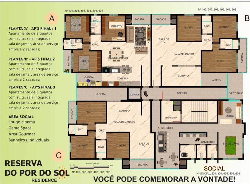 Apartamentos Planta A final 1: contendo: 3 quartos com suíte, sala integrada, sala de jantar, área de serviço e duas sacadas e 2 vagas de garagem.
